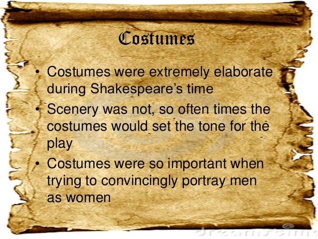 Costumes a major investment for an acting company provided the essential spectacle of the plays and were often second-hand clothes once owned and worn by real-life nobles. Having heard this line in the prologue the audience can. Costumes were very elaborate.